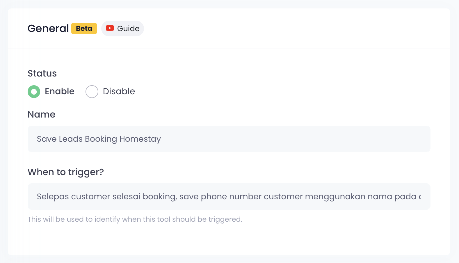 When to trigger - Anda perlu explain kepada AI fungsi tool ini dan bila tool ini perlu trigger.